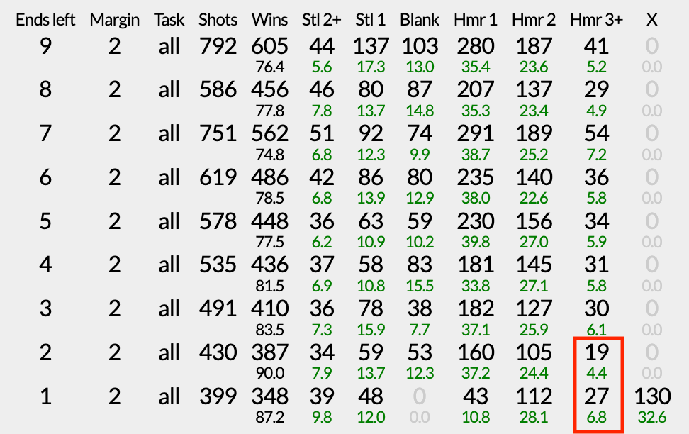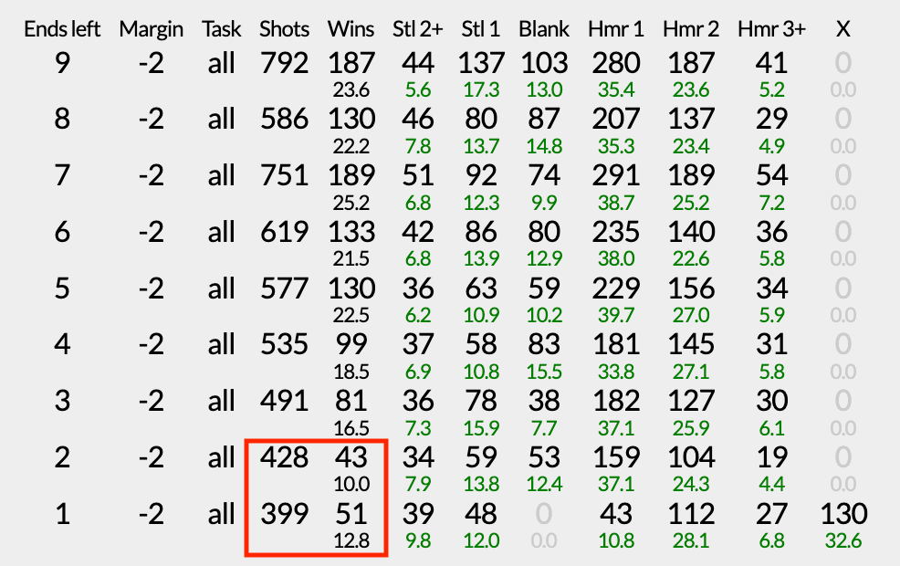 If we look at real-world data, we come to same conclusion. Using data from my shot database from the Slams, Curling Canada events (Brier, Canada Cup, Pointsbet Invitational, etc.), Olympics, Worlds, and Euros, we find that teams have gone 43-385 (10.0%) when down two with hammer with 2 ends left and 51-348 (12.8%) down two with hammer in the final end.