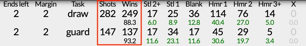 We can drill deeper into that shot data to help us out. PEI opened with a draw in this case which is what set the blank into motion. Teams up 2 without hammer with 2 ends left that opened with a guard have gone 137-10 (93.2%), while teams in that situation that opened with a draw have gone 249-33 (88.3%).
