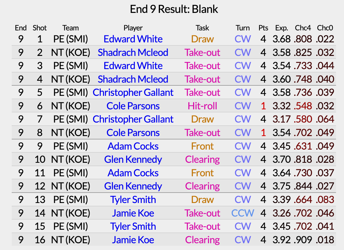 It’s close, but based on history, it appears it’s PEI that made the mistake in this end. The analysis isn’t quite this simple, of course. You might notice in that graphic that the blank rate is hardly different whether the team throwing first puts up a guard or comes in. That’s because the team with hammer has normally guarded regardless. NWT’s hit was just the 16th recorded in my collection of shot data, with this being the third victory in that sample (for an 18.8% win rate).